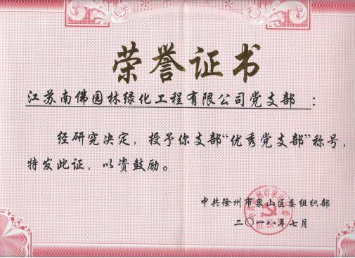 江苏ld(中国)官方网站绿化工程有限公司在2018年度党建工作中成绩优异,业绩突出,荣获“优秀党支部”荣誉称号。